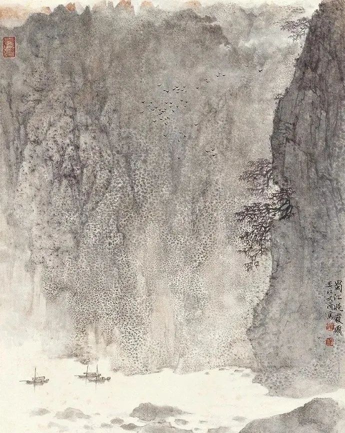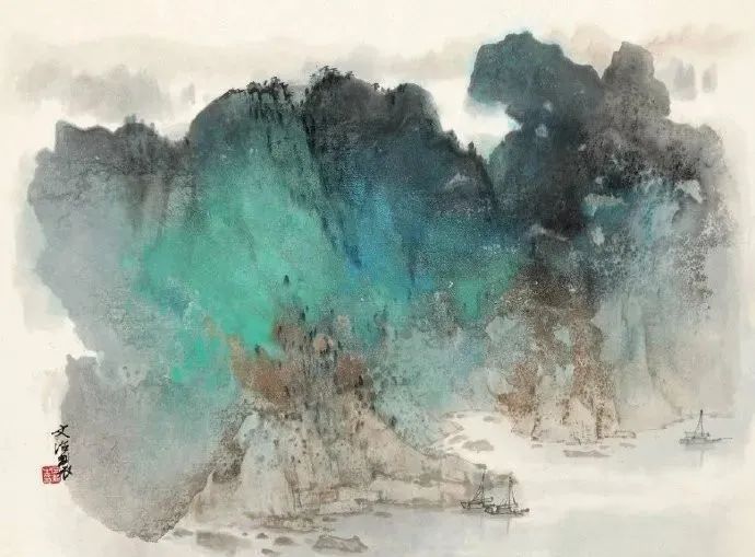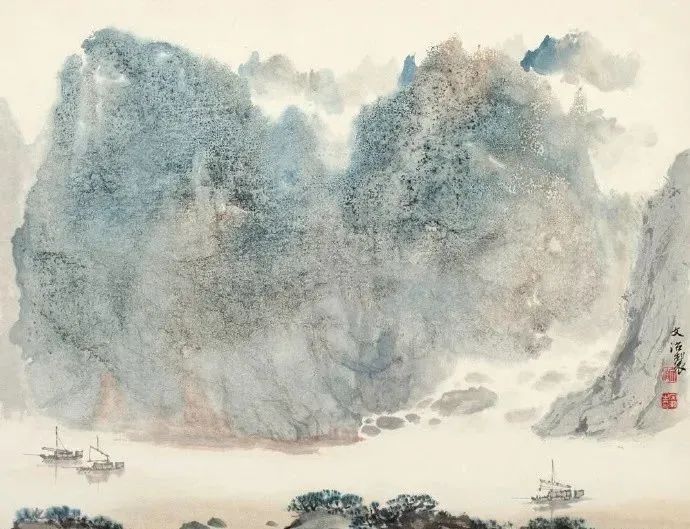 宋文治的山水画,入手“四王”,后转益多师,翰墨融洽南北,骨力劲健,声势高迈,善作高远、深入之景;却又喜绘江南三月,征象崴蕤,另具娴齐之姿,在始创山水画新貌上有声誉。