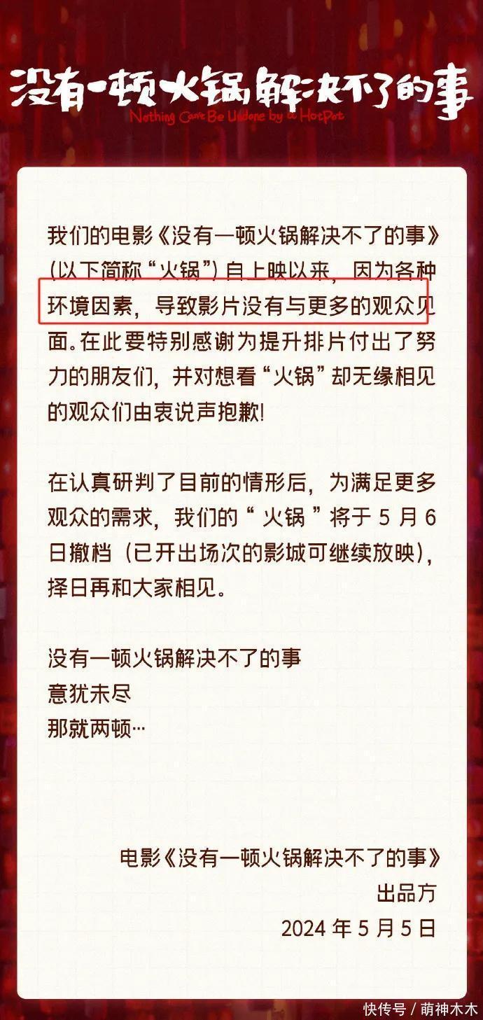 片方清楚《暖锅》因为各式环境要素没能跟更多不雅众碰面,并感谢了为擢升排片费事的一又友,然而过程研判地方后遴荐撤档。天然片方并未袒露具体的撤档原因,然而各式补充语言无疑不是示意排片差,把锅甩给了外部,而不是从影片根柢想考。