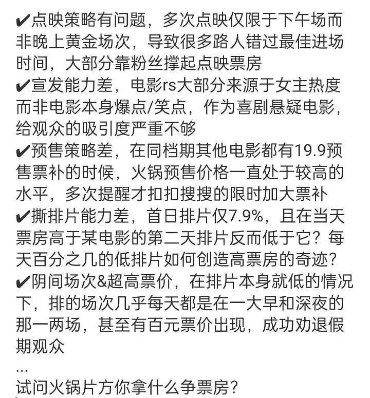 电影票房跟排片档期有一定相关,然而并不是根柢原因。《暖锅》票房差一是电影口碑莫得立起来,二所以杨幂为主的宣发政策让不雅众对影片莫得信心,而这两点就弥散糟蹋电影。